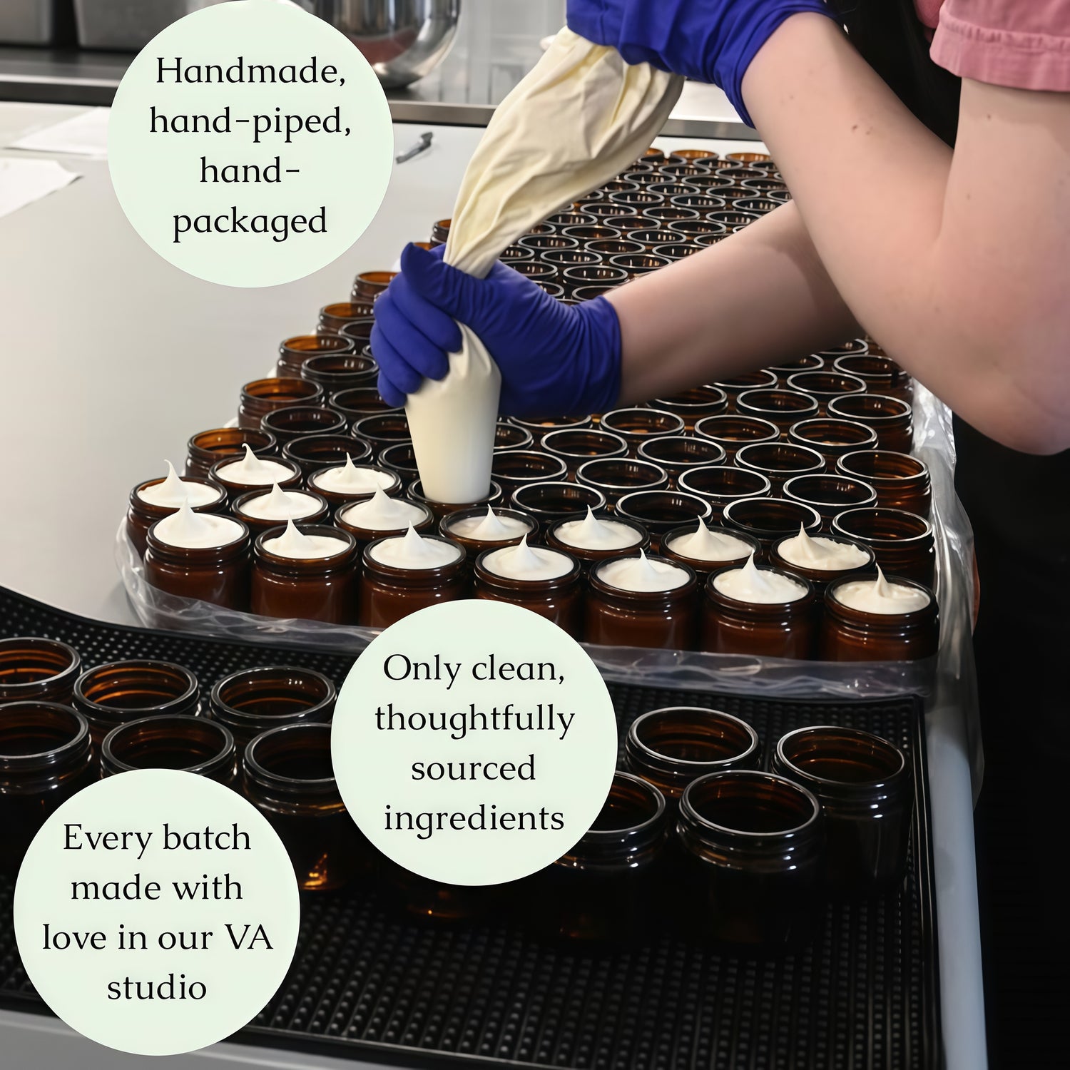 Each batch is made by hand in our Virginia studio, where every jar is carefully piped and packaged one at a time. We use only clean, thoughtfully sourced ingredients to ensure the highest quality from start to finish. This is skincare crafted with intention—not mass production.